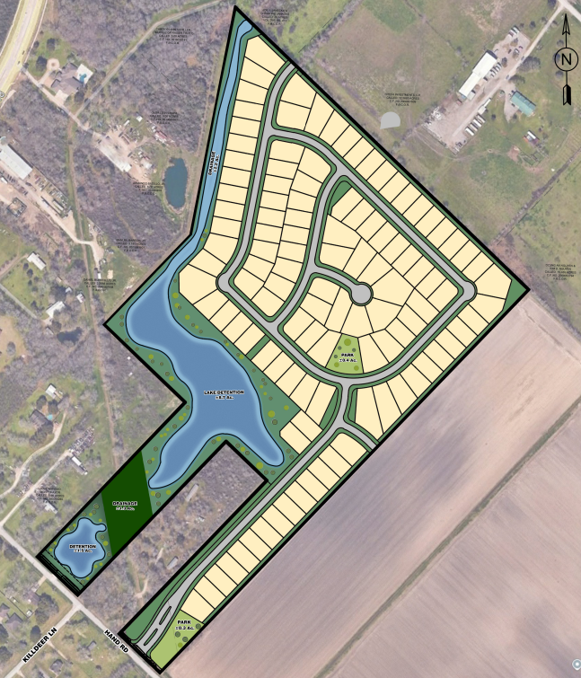 45.1- acre single family residential units located at just South of Rosenberg, Texas within Fort Bend County in Pleak, Texas. Key featuring Retail & Restaurant Condos, Office condominiums as well as Event Center. We have a contract with D.R. Horton (subject to change), a well-established national homebuilder known for its quality and reliability.